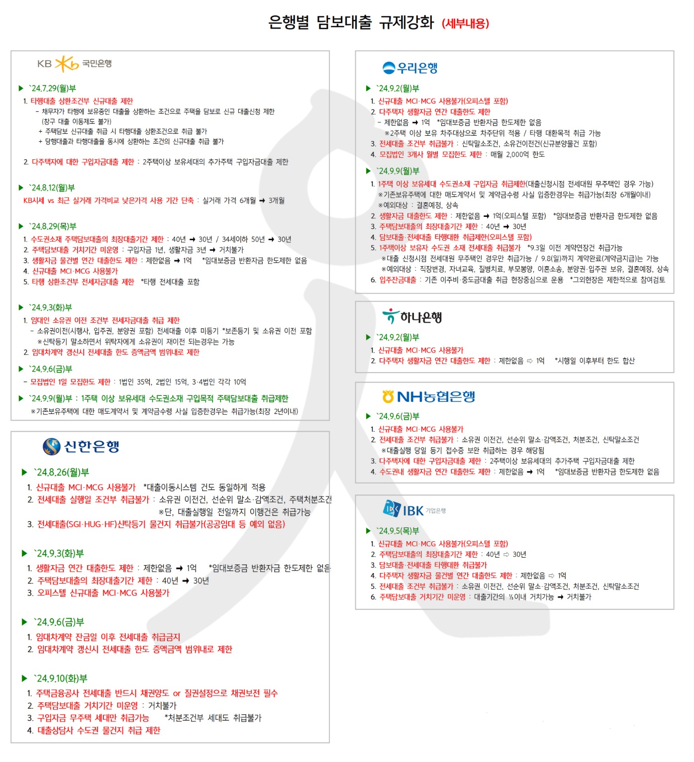 시중 은행별 담보대출 규제강화 내용입니다.